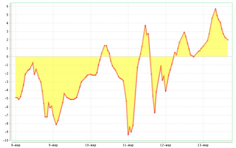 08 марта – ночью переменная облачность, без осадков, днем облачно, небольшой снег. Ветер юго-западный ночью 4-9 м/с, днем 6-11 м/с. Температура ночью -13°С, -18°С, днем -2°С, -7°С.