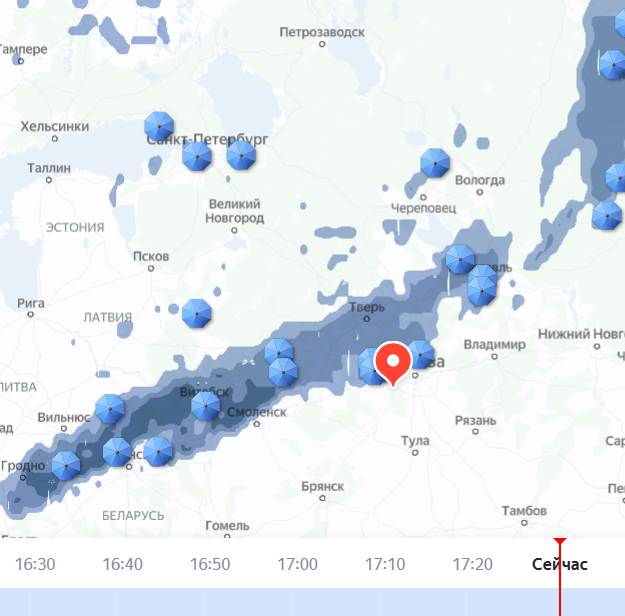 По карте осадков сейчас должно поливать где-то в районе Зеленограда. До нас осадки доберутся часа через три.