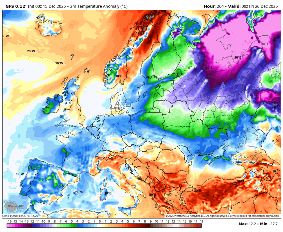 ЖФС - прогноз аномалий Т2м и значений Т2м утром 26 декабря