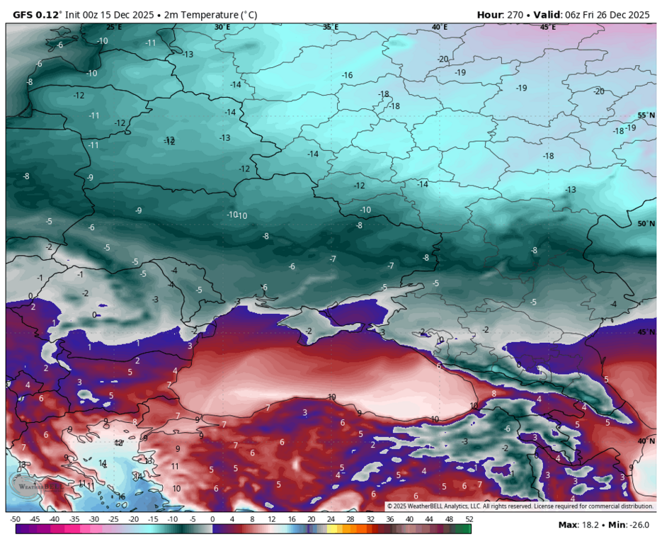 "ЖФС - прогноз аномалий Т2м и значений Т2м утром 26 декабря