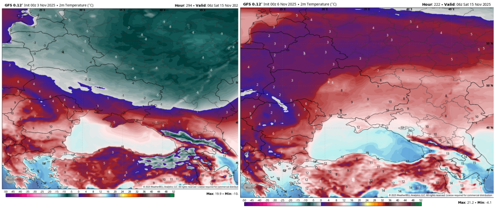 Прогнозы Т2м от ЖФС на 15 ноября, слева от 3 ноября, справа от 6 ноября (т.е. сегодня)