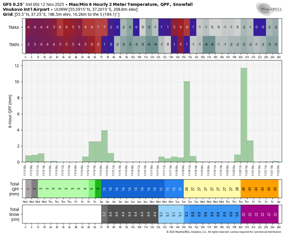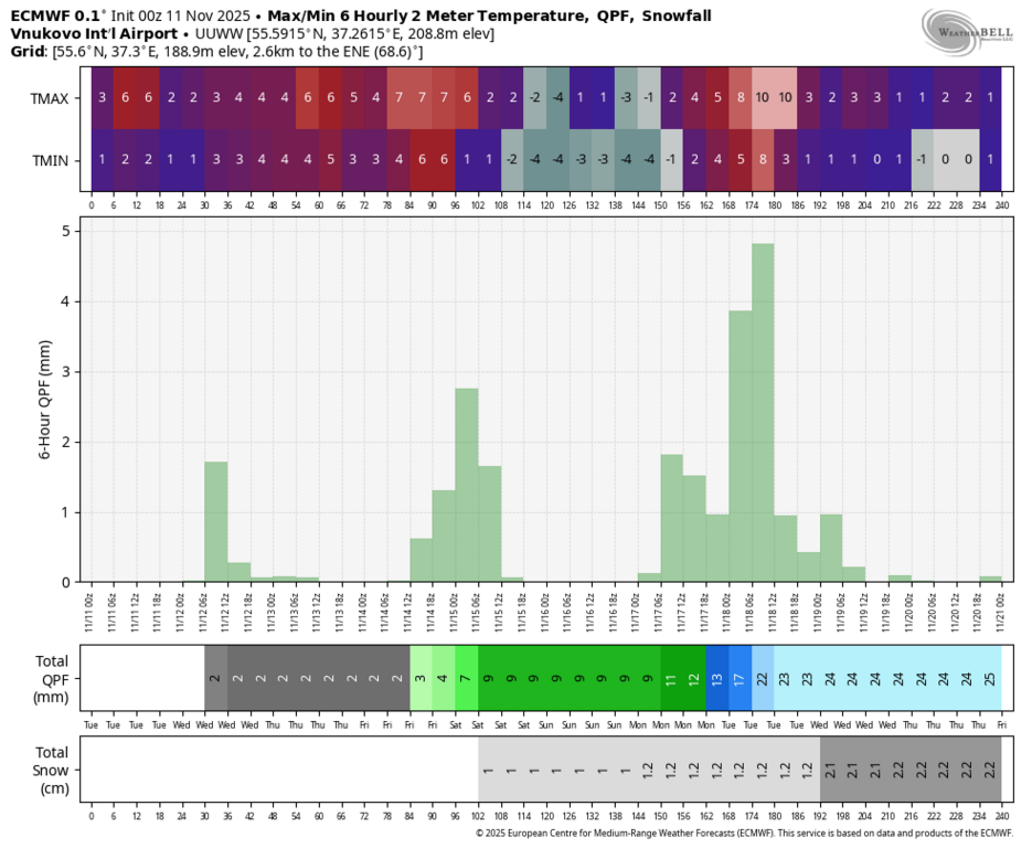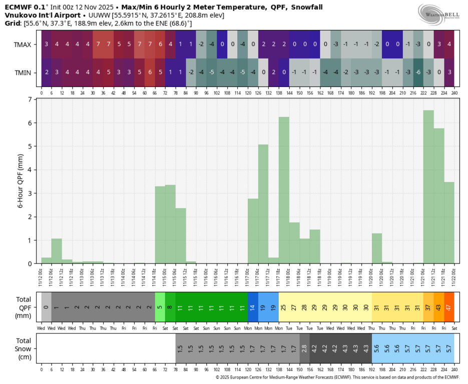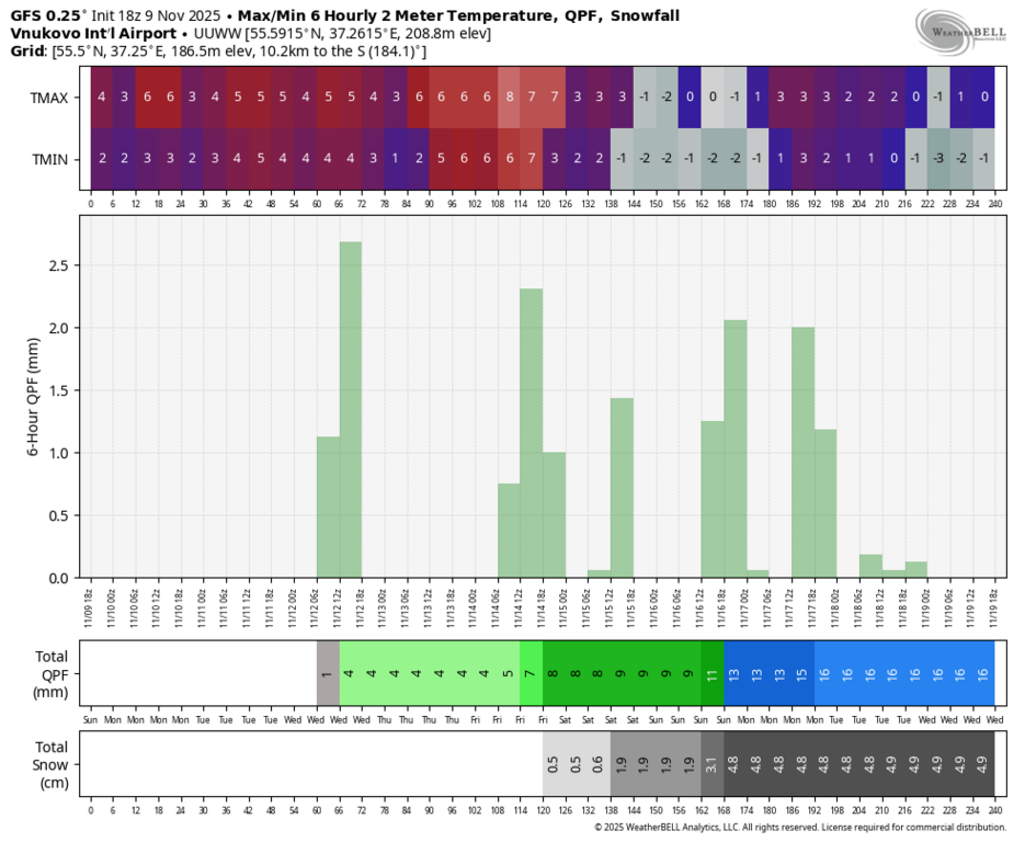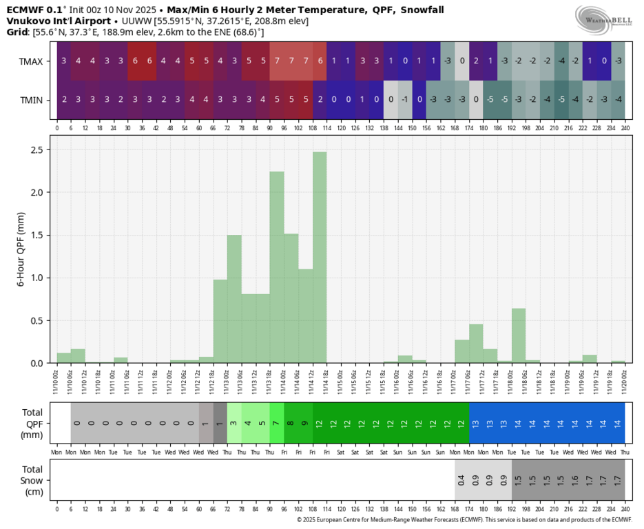В прогнозе на 10 дней много осадков (почти 50 мм), частично в виде снега.