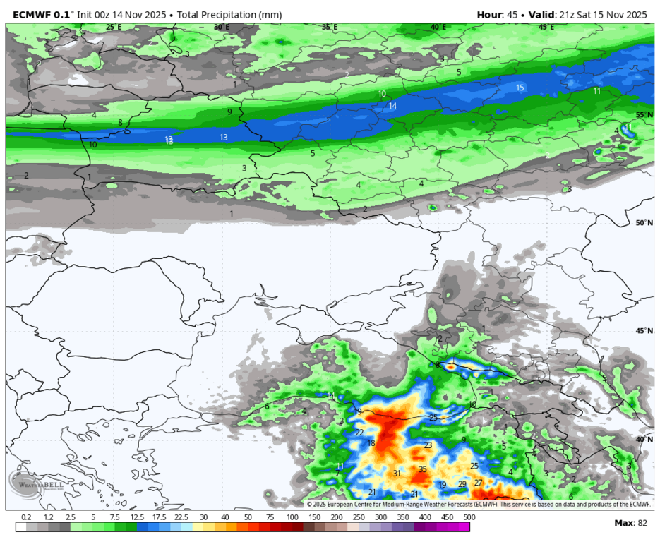 ЕЦСПП - прогноз осадков за субботу 15 ноября - общие и из них в т.ч. снегом
