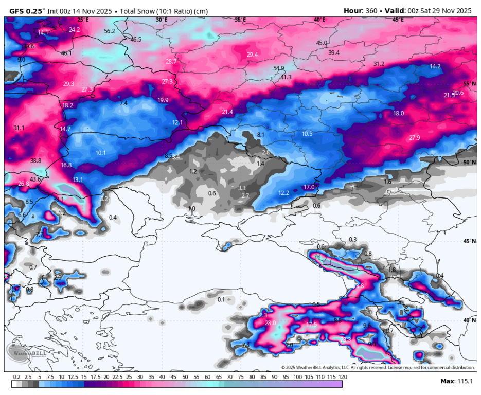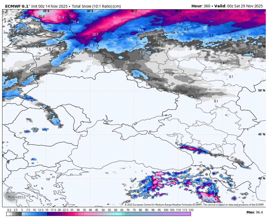 ЖФС и ЕЦСПП - прогноз осадков в виде снега за 15 дней (до 29 ноября)