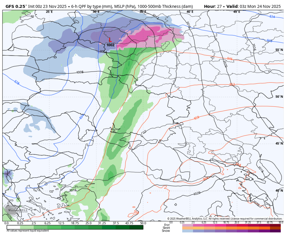 Похожая картинка с осадками в виде снега (внутри МО) была в прогнозе на 15 ноября от фронта циклона Квирин