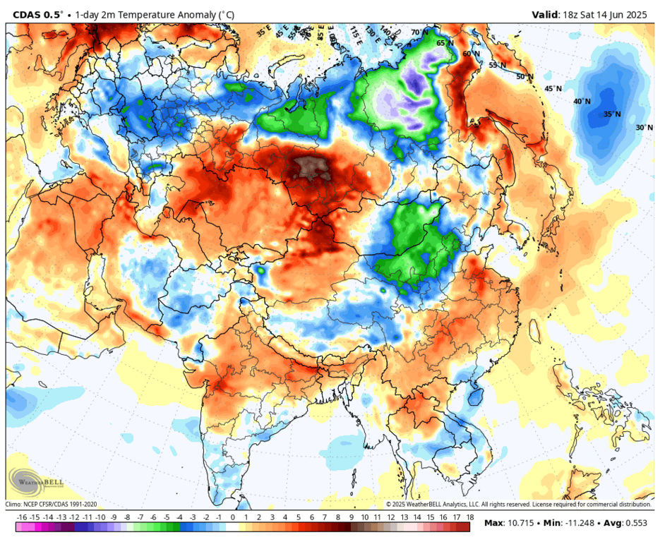 Похоже, июнь в Средней Азии будет нежаркий (около нормы или даже чуть ниже). В ближайшие дни засилье циклонов и не выше 30...35, потом небольшое потепление, а в середине месяца заток холода с С-СВ (встанет АЦ на юге Урала).