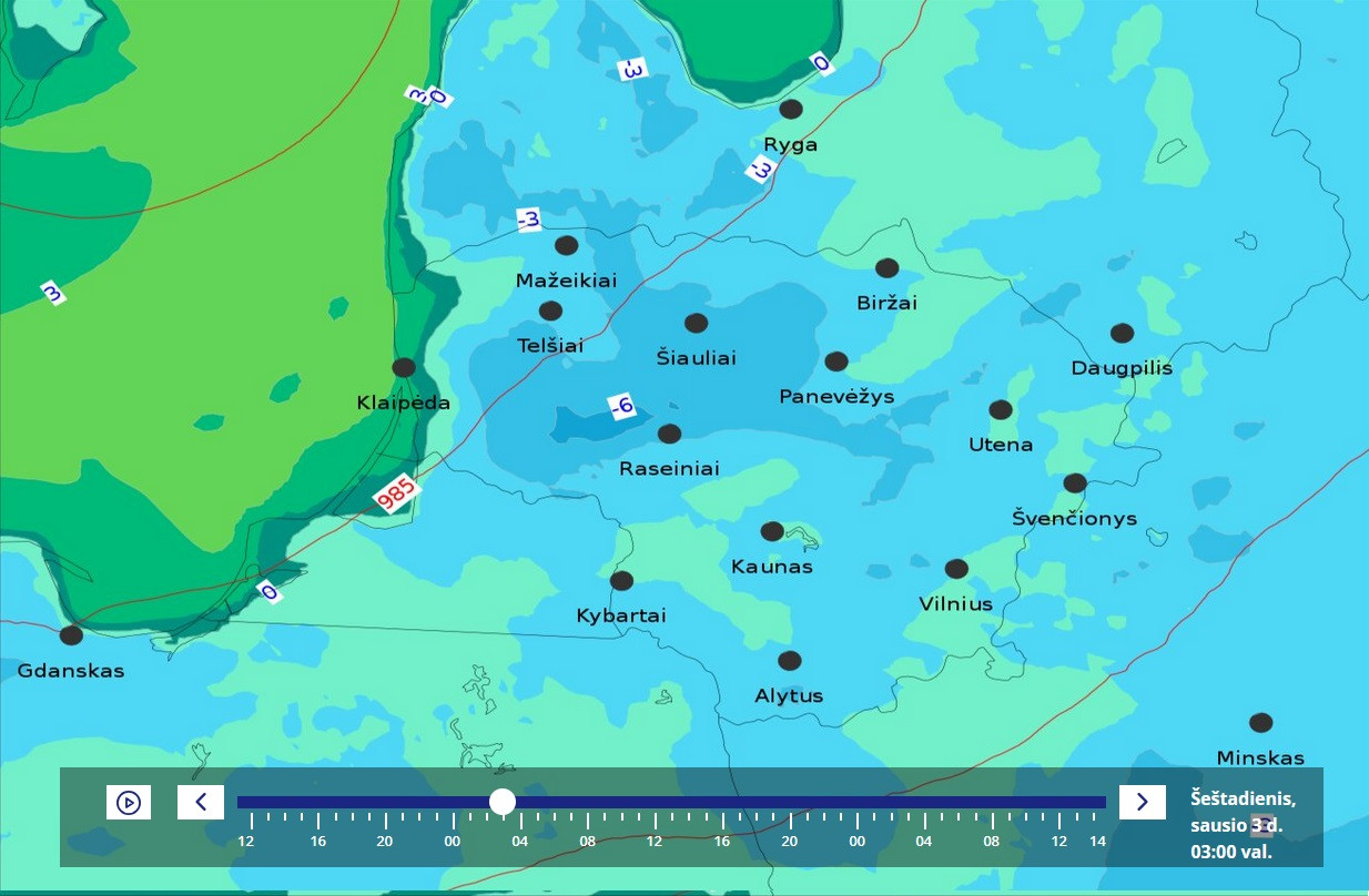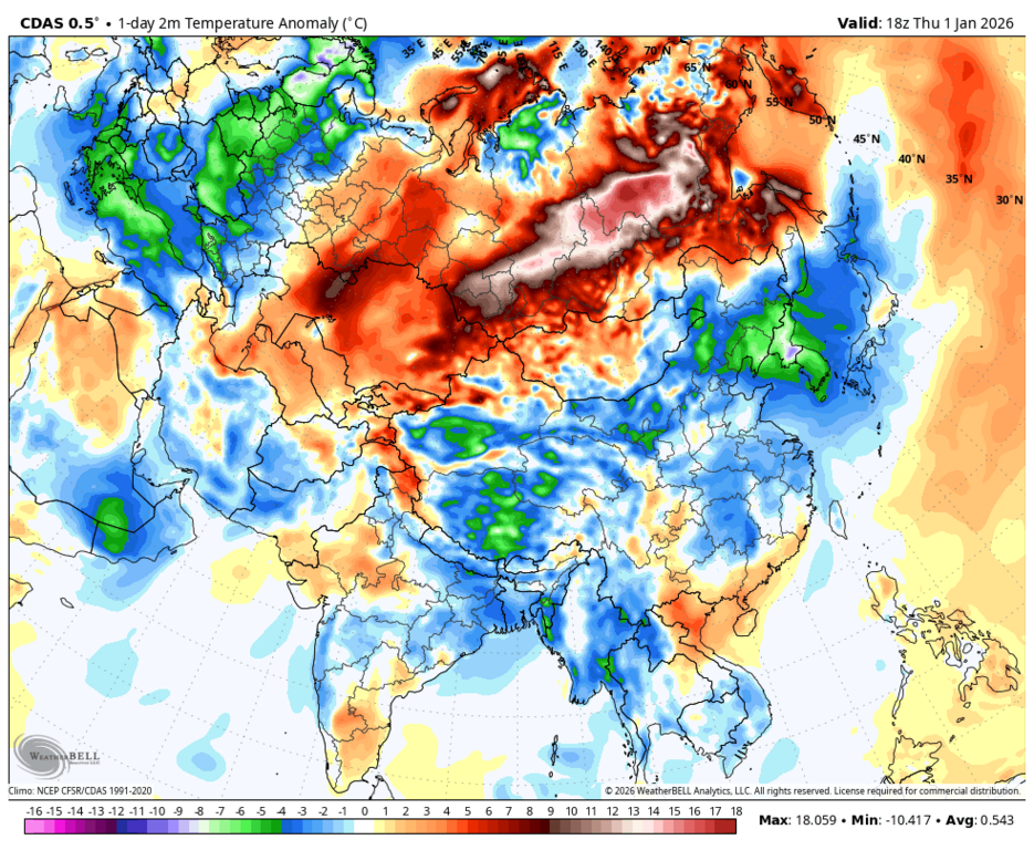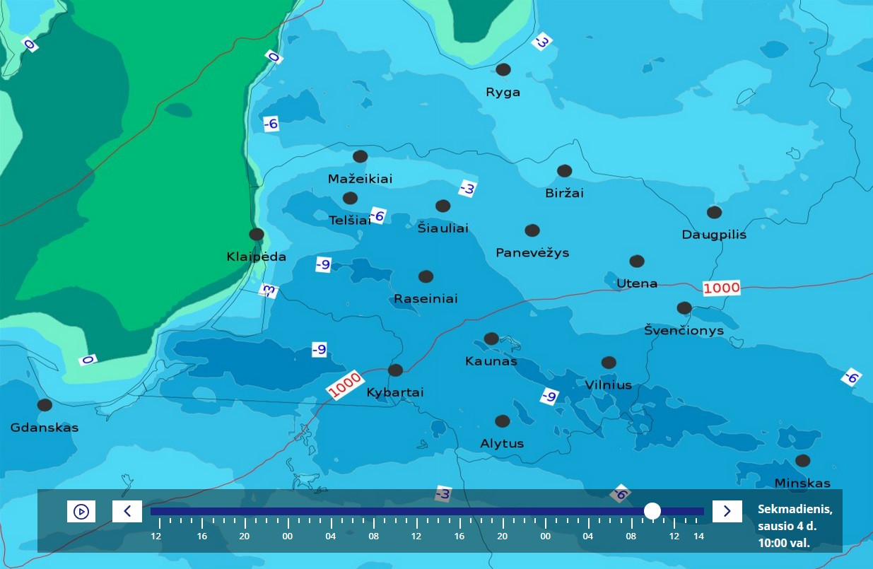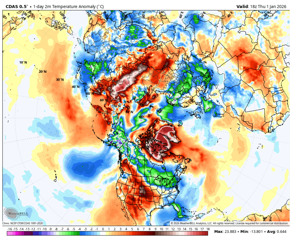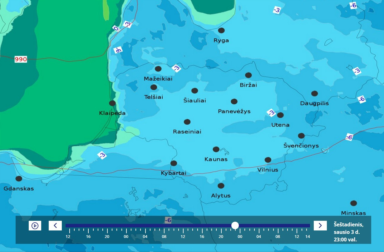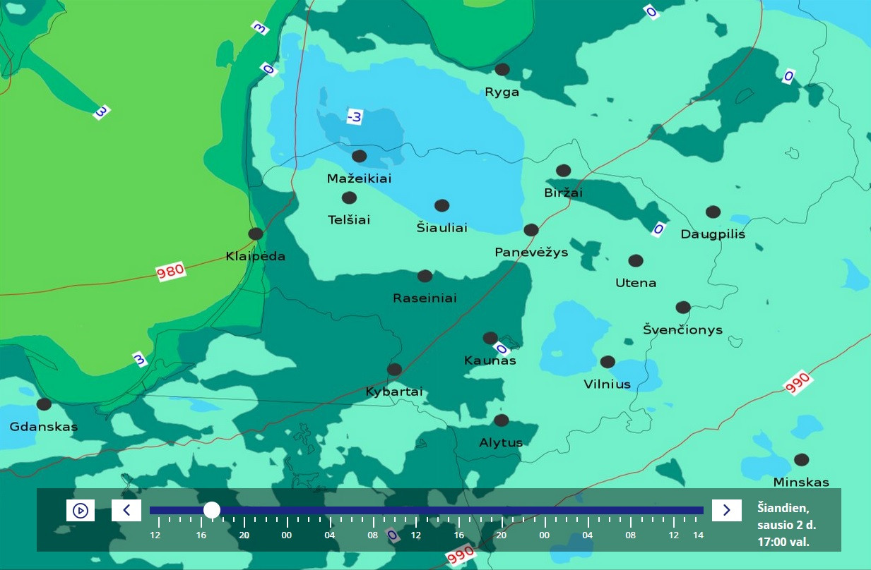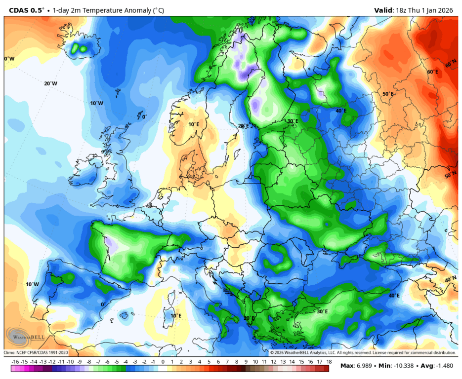 Увы, но карта аномалий опять мимо факта. У меня вчера среднесуточная была только 0.0, а норма всего января всего -2.1, при том, что в начале она как раз 0.0, ибо норма всего декабря -0.1 за счёт слегка морозной первой половины, но по сути норма суток в декабре около 0.0, поэтому и начало января такое же. Резко холодают нормы суток лишь со второй недели января. При этом даже в Литве (усреднённо по всей стране) есть 2 дна самых низких норм суток (во второй половине января и во второй пентаде февраля - между ними есть подъём).