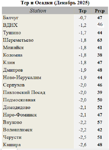 По ссылке от PavelSky итоговая таблица по МО за декабрь 2025 - ранжировка станций по Т2м и осадки за месяц (по ВДНХ осадки из климатического синопа станции)