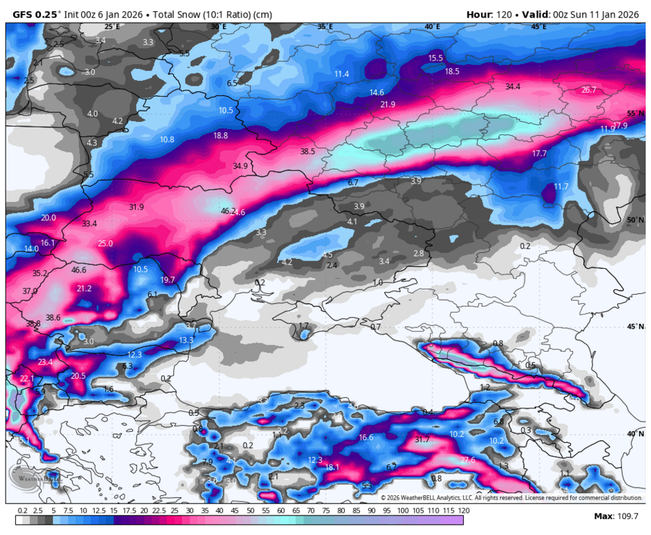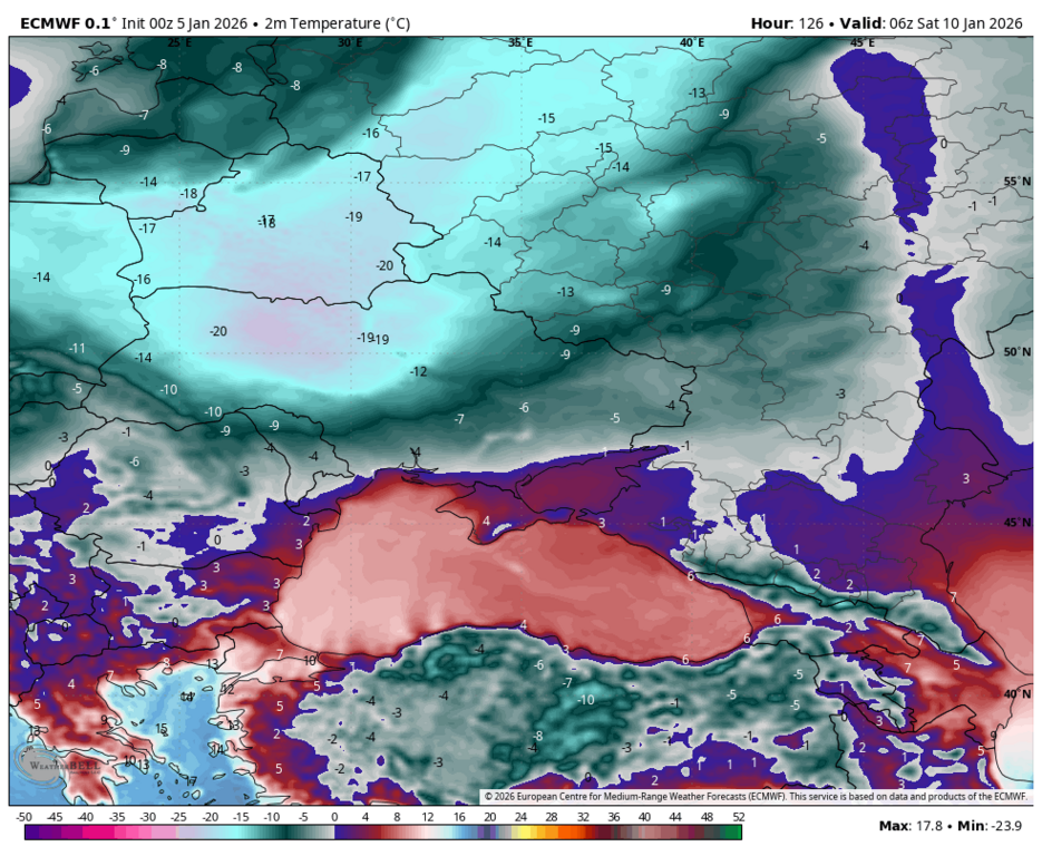 Это особенность циркуляции. Основная масса холода либо застряла не дойдя до черноземья, либо реже прошла ЮЗ, на Европу.Но бывают и исключения. Зимой 1971-72 было то масштабное вторжение ААЦ. Вся ЕТС в морозе. Замерзало и Черное море...