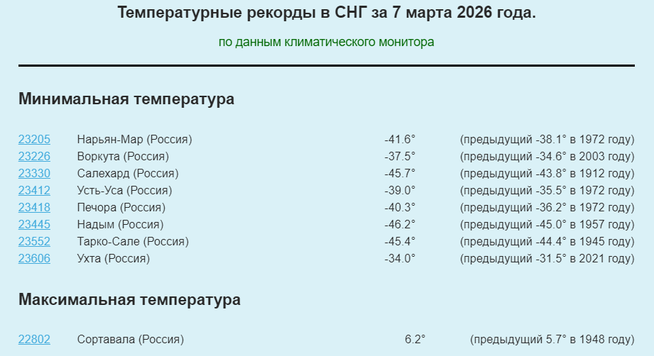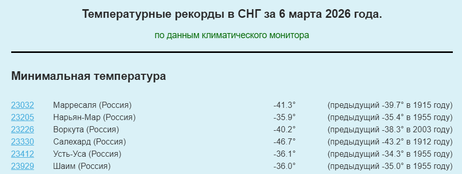 В Коми и ЯНАО снова побиты рекорды минимальных Т2м. В Салехарде опять побит рекорд 1912 года