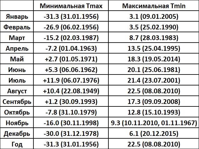 Самые высокие Tmin и самые низкие Tmax по месяцам в Смоленске: