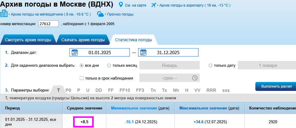 В Москве 2025 год вышел на первое место в списке самых тёплых. На ВДНХ среднегодовая температура +8,4, в МГУ - +8,6.