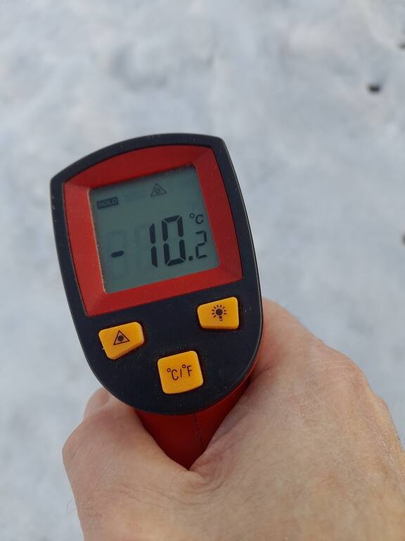 Вчера рано утром посетил участок. В 8 утра датчик показывал -5,7 гр.. Так что все что растаяло предыдущим днем, ночью успешно замерзло. Ледяной наст на поверхности снега был настолько прочный, что аккуратно смог походить по участку без охотничьих лыж.