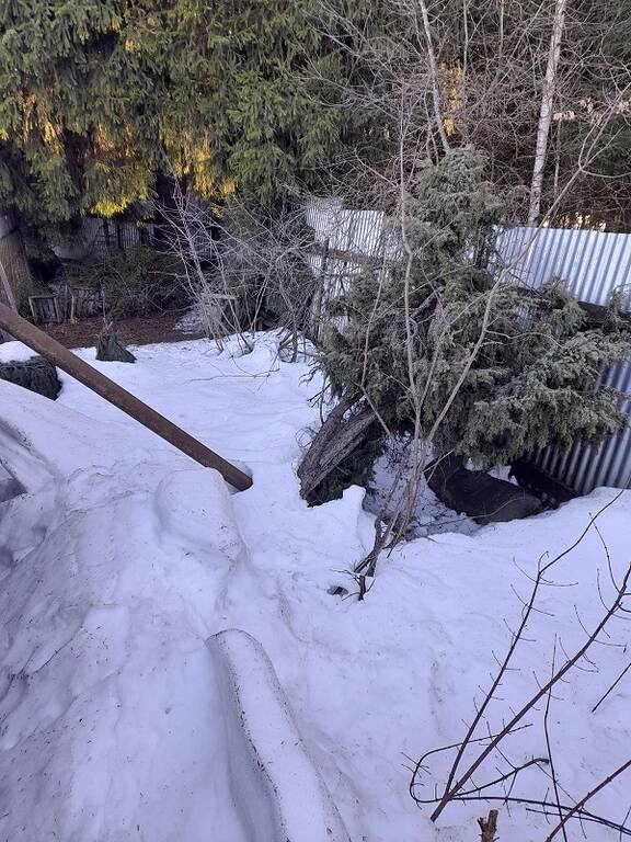 Обнаружил еще одно повреждение - снег завалил тую да так, что похоже вывернул корень из земли. Сейчас корень еще под снегом, но дерево практически уже лежит на заборе