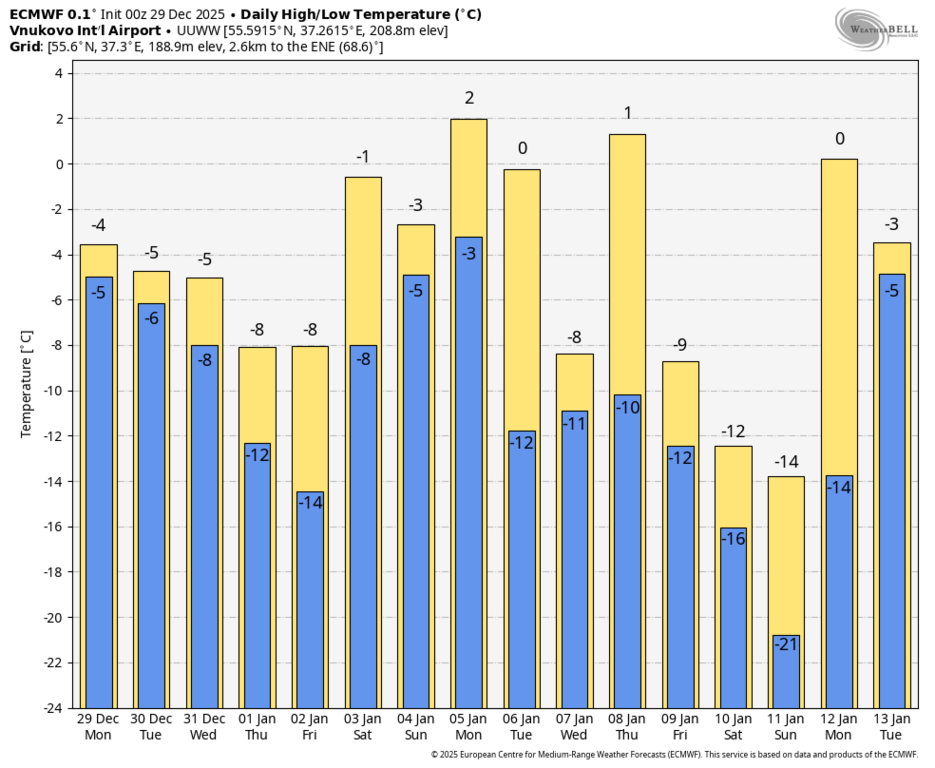 Пока очень рано о подобном говорить, вон на первые числа января уже околонулевые Т. А дальше вообще смотреть пока бессмысленно. Но 31-е, видимо, действительно будет по-настоящему зимним, что большая редкость. Обычно в этот день были либо околонулевые, либо совсем слабый минус.