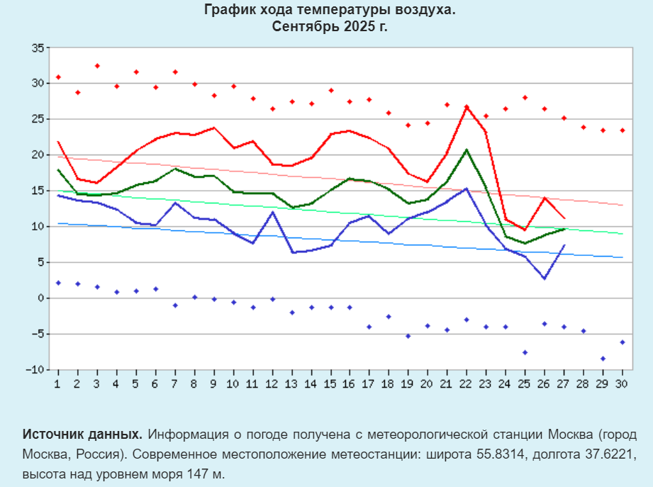 Spasatel 2025-09-28 15:27:44 | Оказывается существуют не только максимальные температуры, но и минимальные. И для них также подсчитывают климатические нормы (синяя линия на графике)