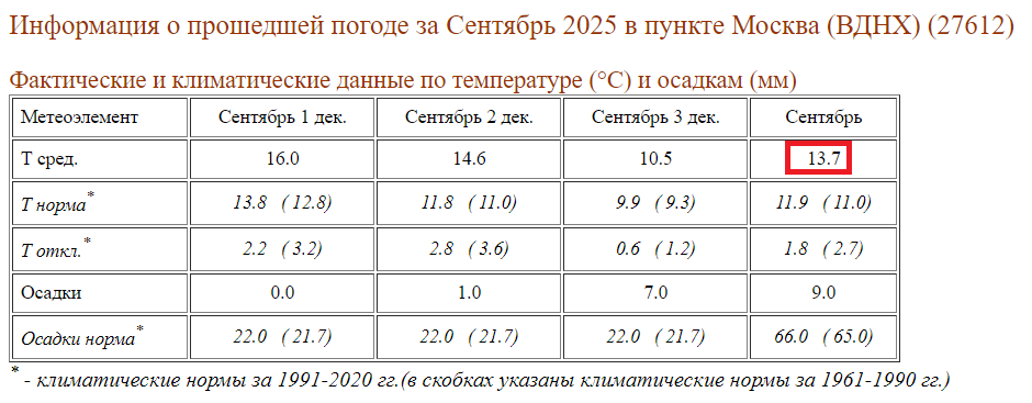 ded 2025-10-02 13:25:09 | Редкий случай - в климатическом синопе ВДНХ за сентябрь 2025 осадки совпали с климатическим монитором - 9 мм и там и там. И это меньше, чем в сентябре 2024.