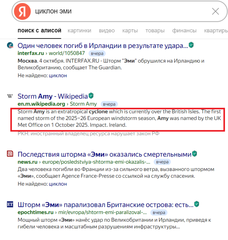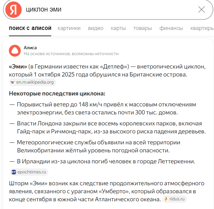 ded 2025-10-05 04:26:27 | alexeyich Имя Эми было присвоено этому циклону Британским мет-офисом. Они именуют некоторые циклоны опасные конкретно для Великобритании. Эми это первый поименованный циклон в этом сезоне (видимо осенне-зимнем) 2025-2026 г.г.