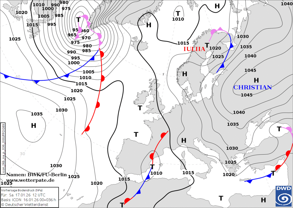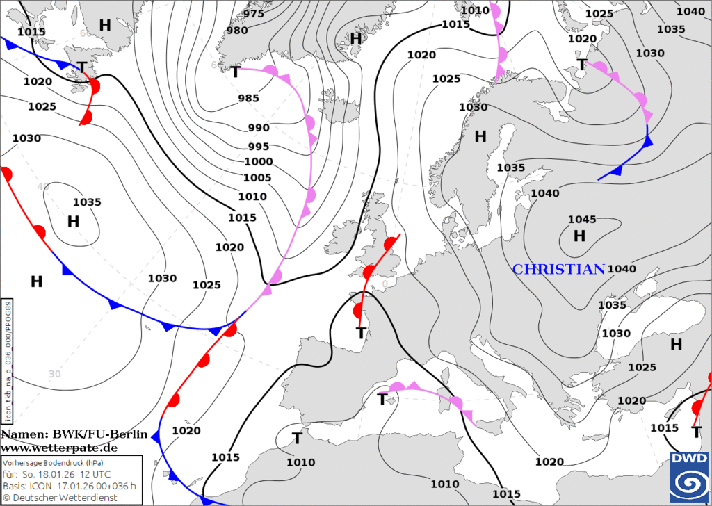 Розовая зона наиболее низких Т2м сдвинулась еще южнее и цапает только самый юг МО. Редкий случай - на карте только одно имя, всех остальных Кристиан поел. Однако, на севере Архангельской области уже появился небольшой циклончик без имени, который двинет на юг и смягчит Крещенские морозы в том числе и в МО. |