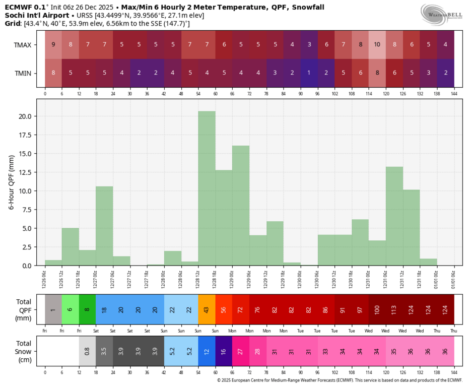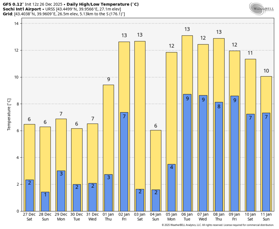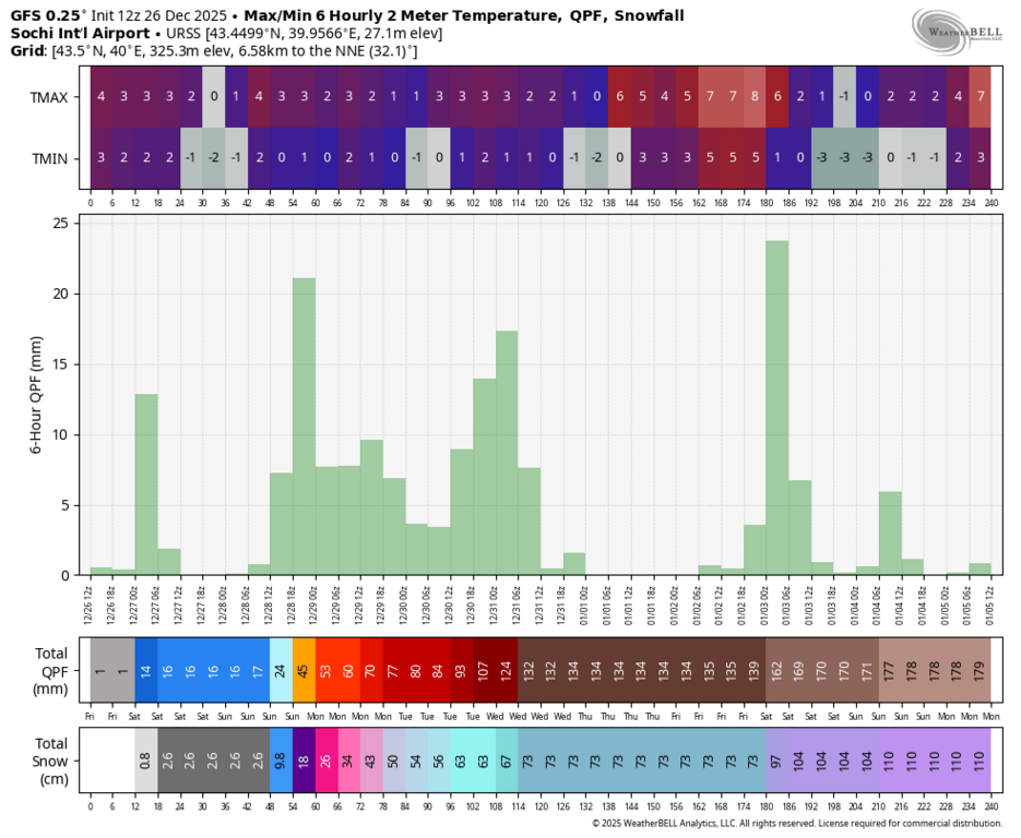 В Сочи в этот же период +5...+10, сильные дожди со штормовым ветром (кол-во осадков за 4 дня около 100 мм), в горах очень сильный снег, высокая лавинная опасность.