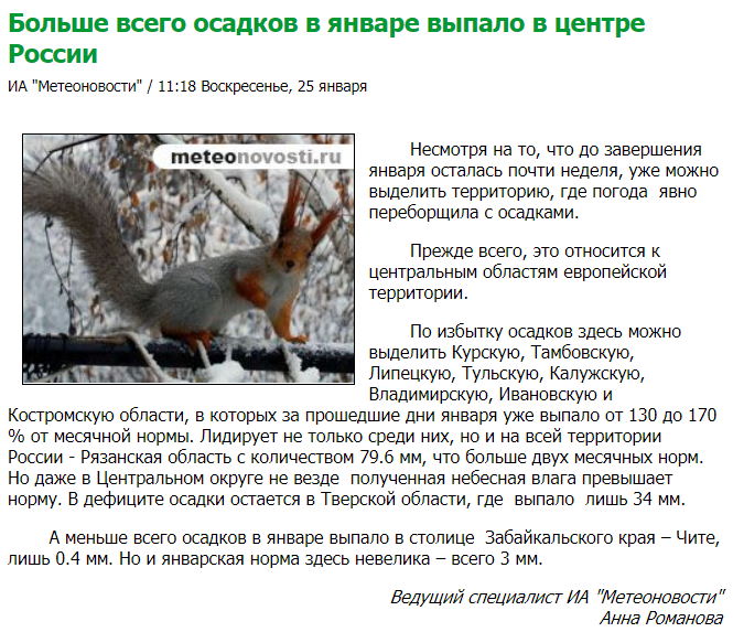 Вчера она предсказала более теплую ночку, а сегодня - кучу осадков за январь. Она явно в курсе, что нападает в Москве за оставшиеся дни января, если озаглавила новость глаголом в прошедшем времени Больше всего осадков в январе выпало в центре России ИА "Метеоновости" / 11:18 Воскресенье, 25 января ![]() |