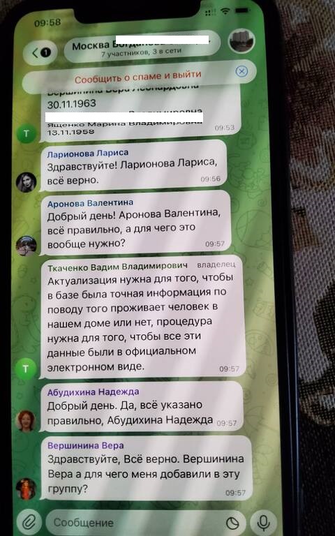 Сегодня опять же в Телеграмм пришел якобы домовой чат (по адресу прописки) с тем же списком фамилий и с той же просьбой уточнить какие то данные. Скрины этого чата