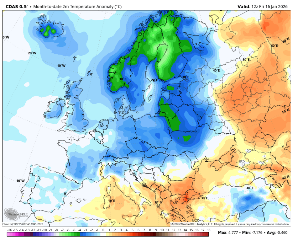 | Alexandross 2026-01-16 20:13:16 | В Смоленске первая половина января вышла с Tср -10.1, Tан -4.5. Tmin -24.1 (16 января), Tmax -1.6 (3 января). Выпало 41 мм осадков, при месячной норме 48 мм. |